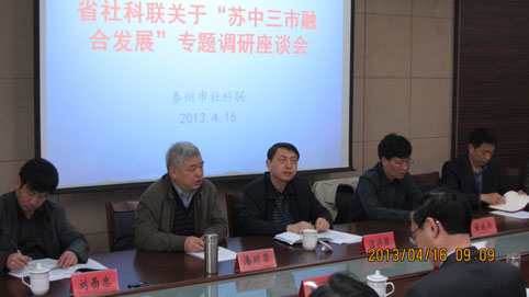 “深化沿江开发,促进融合发展,加快苏中崛起”是江苏省委、省政府今年确定的促进区域协调发展的重点工作之一。为深入了解苏中三市经济社会发展现状及其在沿江开发建设进程中面临的困难和问题,以便在今年将要召开的苏中工作会议前向省委、省政府提出相关对策建议,省社科联专门组织课题组,由党组副书记、副主席汪兴国带队,于4月15-17日先后赴扬州、泰州、南通三市开展专题调研,听取当地发改委、经信委、农委、建设局、环保局等部门负责同志以及高校专家学者的意见。